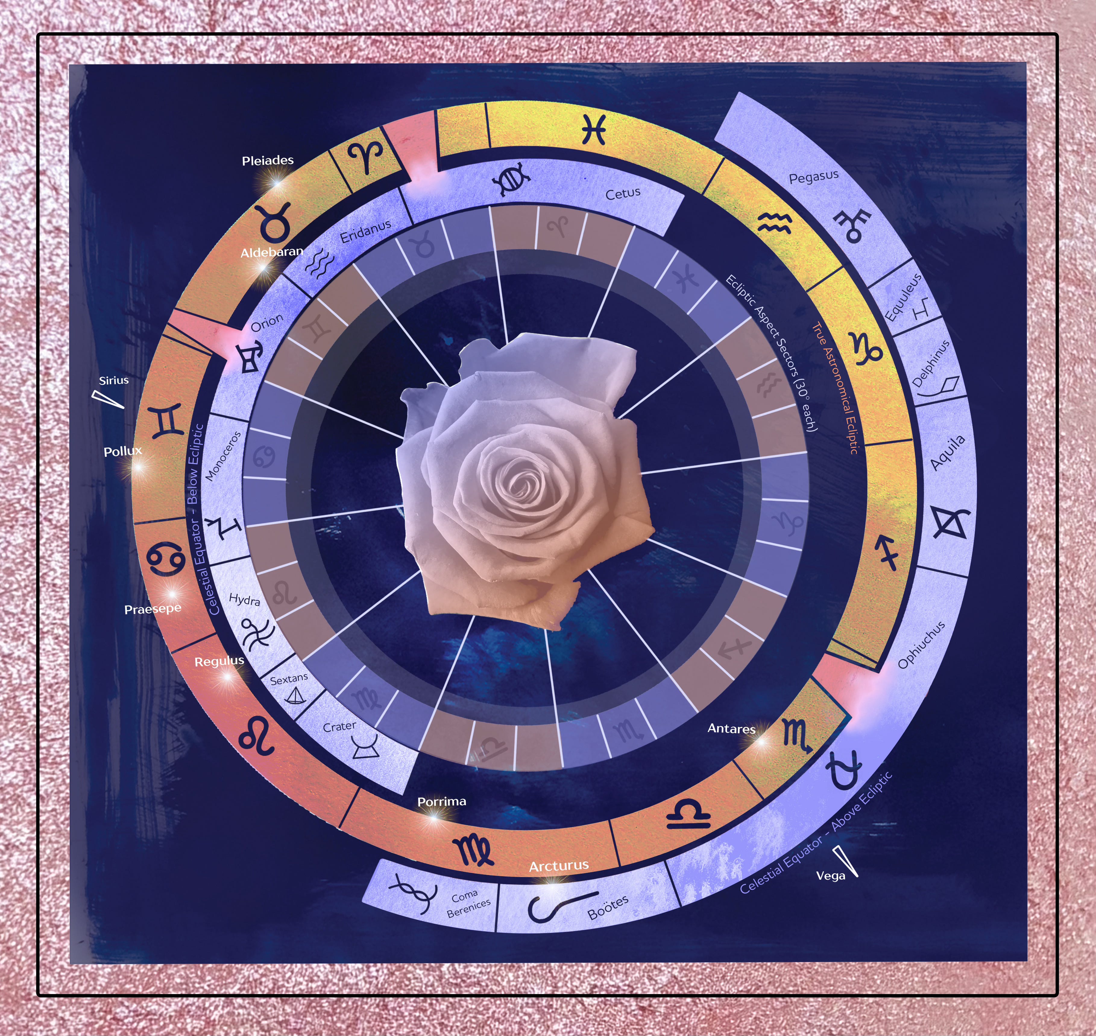 The celestial equator constellations, some of the fixed stars and other cosmic points are incorporated here. But, this chart is already shifting through a contraction and expansion process. Stay tuned!